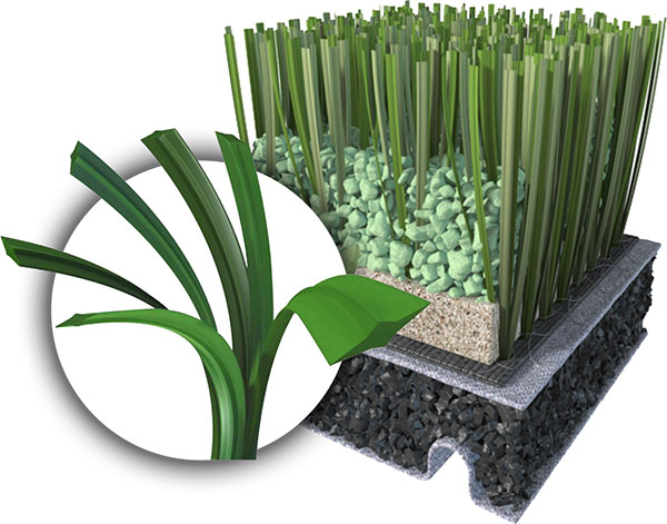 人造草坪结构图如下,它和天然草坪区别不大,缓冲作用良好,可有效防止侧滑、球的弹地和滚动正常。并不会像天然草坪那样柔滑,在雨天很好的保护运动员在比赛过程中发生的侧滑情况,也不会因为草坪而影响球速和运动轨迹。